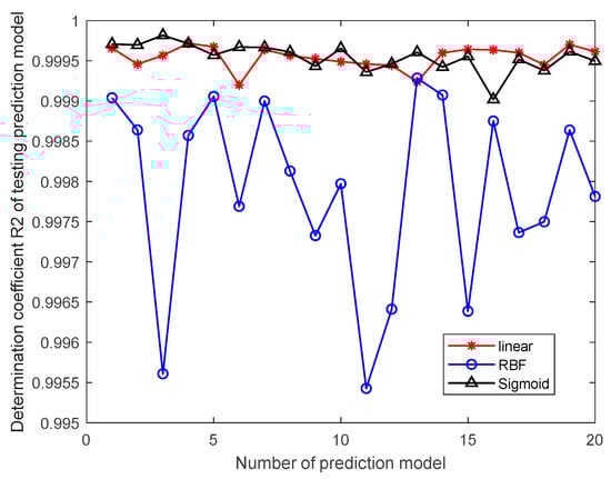 To objectively evaluate the effectiveness of SVR predictions, two metrics, the mean squared error E and the coefficient of determination , are used to evaluate the performance of SVR prediction models [36,37]. The smaller the mean squared error E, the better the performance of the SVR prediction model. The coefficient of determination is in the range of [0,1], and the closer is to the value 1, the better the SVR prediction model. Otherwise, the performance of SVR prediction model is worse. If the resulting SVR regression model does not satisfy the set requirement, the SVR regression model is reconstructed by modifying the model parameters or changing the kernel function type until the set requirement is satisfied. The mean square error E and the coefficient of determination to be determined are calculated as follows: