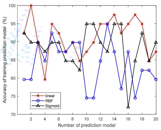 Accuracy distribution of 20 training prediction models under different kernel functions.