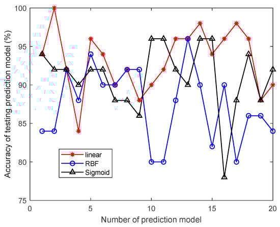 Accuracy distribution of 20 testing prediction models under different kernel functions.