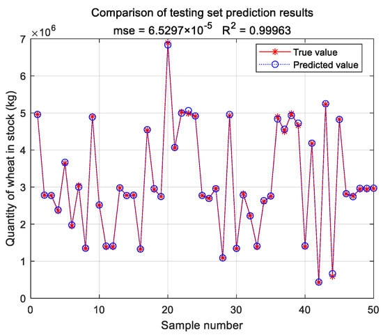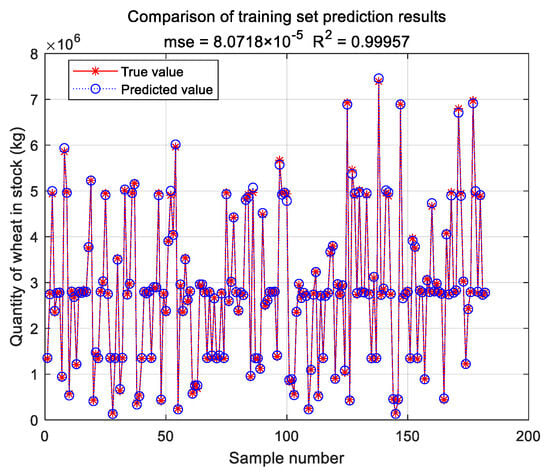 Since the SVR prediction model has the advantage of obtaining the optimal solution in a restricted sample, it is particularly suitable for the analysis and prediction of small-sample problems. In this study, a total of 232 sets of samples were collected for model training and testing. We randomly selected 182 samples as training samples, and the remaining 50 samples were used as test samples. A partial sample of the amount of established wheat stocks is given in Table 1. The sample characteristics selected in this study include the initial moisture content (IMC), the measured moisture content (MMC), the measured bulk density (MBD), the storage time (ST), the measured net volume (MNV), the storage book weight (SBW), and the empirical weight (MW).