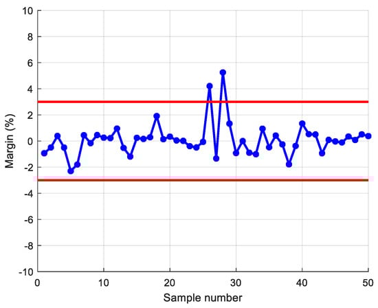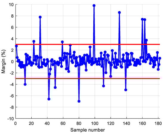 The accuracy of wheat inventory prediction is a direct evaluation of different kernel function SVR prediction models. According to China’s “Food and Material Reserve Law Enforcement Supervision Work Regulations”, an error rate within the range of 3% is considered to be a no quantity problem. As shown in Figure 7 and Figure 8, both the SVR prediction model based on the linear kernel function and the SVR prediction model based on the Sigmoid kernel function had better stability and higher accuracy than that of the SVR prediction model based on the RBF kernel function, regardless of the training and test predictions. Twenty prediction models were trained separately for testing and validation under non-kernel function conditions. The results show that the average prediction accuracy was 93.2 percent for the linear kernel, 87.4 percent for the RBF kernel, and 91 percent for the Sigmoid kernel. The best performance of the SVR prediction model based on the linear kernel function was achieved when the mean squared error, the coefficient of determination, and the rate of correct prediction were taken into account. Experiments were conducted on the construction of SVR prediction models based on linear kernel functions, and the results were predicted using the stock wheat training set, as shown in Figure 9. The predicted results for the stockpiled wheat test set are shown in Figure 10. The difference rate distribution of the 182 training samples used for training is shown in Figure 11. The marginal distributions for the 50 samples used for the test are shown in Figure 12. As can be seen from the test results, the accuracy of this test was 96 percent, which was higher than the average prediction accuracy of this model. The red line in Figure 11 and Figure 12 represents the allowable fluctuation range of the difference rate. If the predicted result fell outside the range of −3% to 3%, it indicated an abnormal quantity of grain in this grain depot.