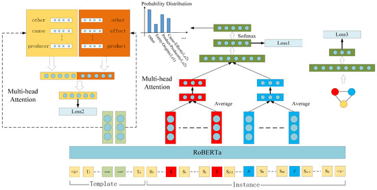 where and are vector representations obtained by splitting the relationship category words, they are generated using RoBERTa. and are vector representations corresponding to the two “<mask>” tokens extracted from the vector representation H. and form a pair, with as the query vector, resulting in vector after passing through the multi-head attention layer. and also form a pair, with as the query vector, resulting in vector after passing through the multi-head attention layer. Finally, it is necessary to concatenate the vectors and and then use the Multilayer Perceptron (MLP) with a softmax activation function to obtain the final prediction:
