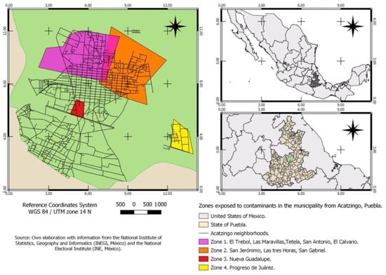 In the locality of Acatzingo de Hidalgo (A), different colonies were selected, constituting three geographical areas: Zone 1 (exposure to pesticides) included El Trebol, Tetela, Maravillas, San Antonio, and El Calvario; Zone 2 (exposure to hydrocarbons and pesticides) comprised San Jerónimo Tamariz, El Capulín, Los Corralitos, La Nueva Concepción, Tres Horas, and San Gabriel; and Zone 3 (exposure to hydrocarbons) included Nuevo Guadalupe. The locality of Progreso de Juárez (B) was designated as Zone 4 (exposure to pesticides) (Figure 1).