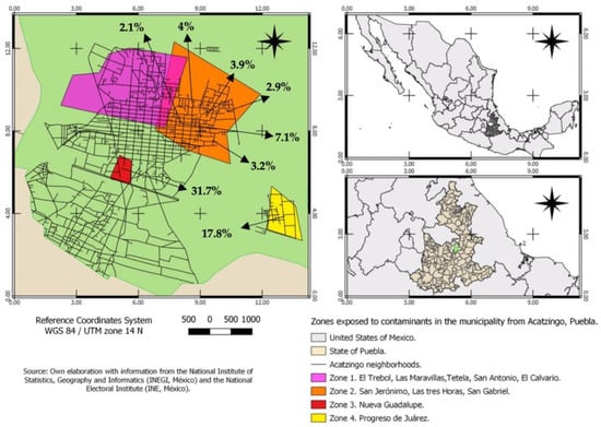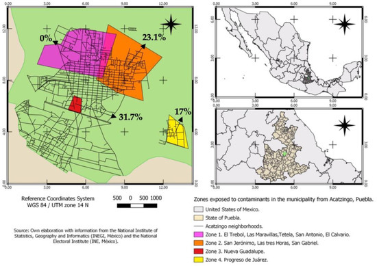 A semi-structured questionnaire focusing on exposure to contaminants and sociodemographic characteristics was administered to 425 individuals. This data collection aimed to obtain general information and assess the probability of developing infectious diseases associated with exposure to hydrocarbons and pesticides in four geographic zones located in two areas: Acatzingo de Hidalgo and Progreso de Juárez. This sample size was deemed sufficient to detect sample effect sizes of approximately two-thirds of the standard deviation.