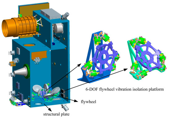As the observation resolution of space payloads continues to increase, high stability and pointing accuracy of satellite platforms are required simultaneously. For example, the collaborative development of the “Solar-B” satellite involved Japan, the United States, and the United Kingdom in 2006, with a short-period pointing stability of 0.09 arcseconds (3 σ)/10 s [1,2]. Similarly, the United States developed the “Space Interferometry Mission” space telescope, which had a pointing stability of 1.6 mas (1 σ)/0.01 s [3]. Flywheels serve as commonly used attitude control actuators in spacecraft [4,5,6]. Nevertheless, due to the high angular velocity at which flywheels typically operate (1000~8000 rpm), various factors like rotor static and dynamic imbalance, non-ideal bearings, drive motor disturbances, and resonance in flexible structures can generate sustained vibrations characterized by harmonic and wide frequency bands. Park et al. reported that the disturbances consist of discrete harmonics of the wheel speed with amplitudes proportional to the square of the wheel speed. Some disturbances include interactions between the harmonics and the structural modes of the wheel which result in large disturbance amplifications at some wheel speeds [7]. These vibrations constitute the primary source of interference that significantly impacts the design performance of payloads [8,9,10,11]. In particular, for optical payloads, the impact of flywheel disturbance cannot be ignored and is difficult to eliminate.