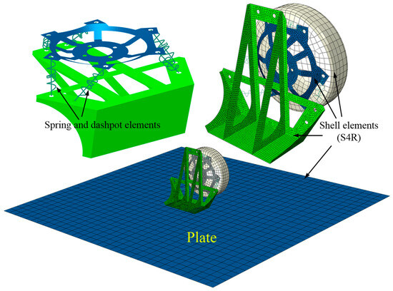 In this section, the idea of the elastic boundary is further verified by a 1.5 m3 cube satellite with elastically supported bottom plate. The settlement of the cube satellite is illustrated in Figure 13. The structural plates are honeycomb sandwich plates, as mentioned above. A uniform mass of 50 kg is applied to each structural plate. The flywheel is mounted on the bottom plate of the satellite. In the finite element model, if the bottom plate is elastically supported, the edges of the bottom plate are connected to the side plates via 60 vertical spring–dashpot elements and 64 transverse spring–dashpot elements, similar to those in Figure 11. The stiffness and damping coefficient of the boundary spring and dashpot are consistent with the previous section. In addition, the responses of the satellite are also predicted for comparison when the bottom plate is rigidly connected to the side plates at its four edges.