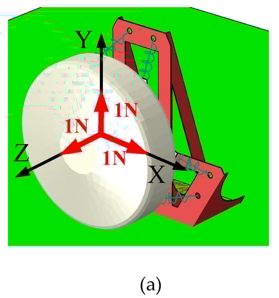 For the excitation of the flywheel in the and directions, the flywheel and structural plate can also be simplified into a 2-stage system ignoring the higher-order mode of the structural plate, as shown in Figure 4. The analytical solution of the force transmissibility is the same as Equation (7). However, due to the much higher in-plane stiffness of the structural plate compared with the out-of-plane stiffness, the response of the plate-isolator system in the X and Y directions within the frequency range of 0–100 Hz is similar to that of the isolator fixed at its bottom. It can be predicted from Figure 6b that reducing the in-plane stiffness of the structural plate to a relatively low value could improve the overall vibration isolation efficiency of the 2-stage system. However, achieving low in-plane stiffness for a honeycomb structural plate through mechanical optimization is difficult. Therefore, the next section will discuss how to enhance the lateral vibration isolation efficiency of the plate-isolator system by adopting the lateral elastic boundary on the structural plate.