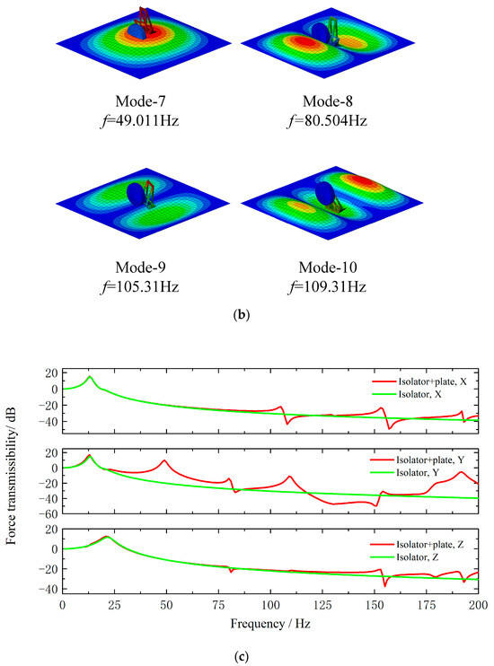 Comparison of force transmissibility between the signal vibration isolation platform and the plate-isolator system: (a) force loading mode; (b) load modes of structural plate; (c) force transmissibility.