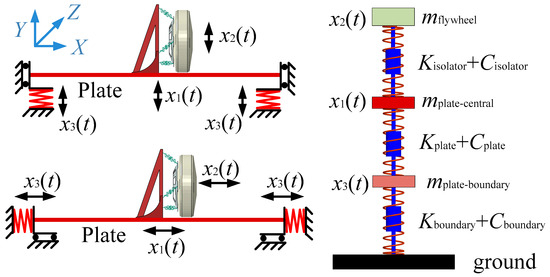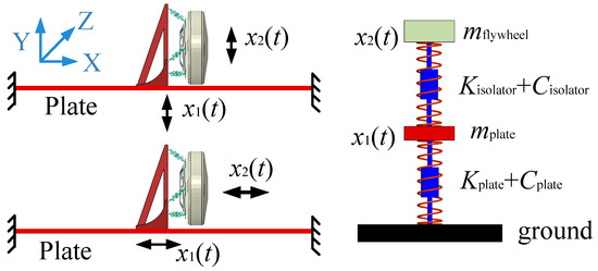 When the flywheel vibrates vertically, as illustrated in Figure 7, mplate-central = 31.7 kg, which equals the fundamental model mass of the boundary fixed plate. As the total mass of the structural plate is 50 kg, then mplate-boundary = (50−31.7) kg = 18.3 kg. Kplate = 3,378,239 N/m and is calculated according to the fundamental frequency and the modal mass of the boundary fixed structural plate. The mflywheel = 8 kg and Kisolator = 56,321 N/m.