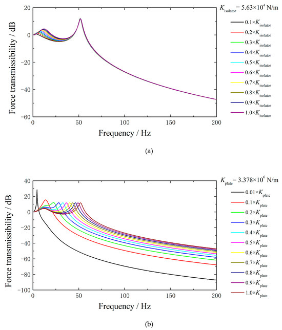 Influence of stiffness on the force transmissibility of the simplified 2-stage plate-isolator system: (a) variation with Kisolator, Kplate = 3,378,239 N/m, Cplate = 10 Ns/m, Cisolator = 600 Ns/m; (b) variation with Kplate, Kisolator = 56,321 N/m, Cplate = 10 Ns/m, Cisolator = 600 Ns/m.