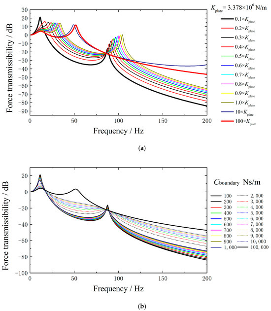 Figure 8a illustrates the influence of the boundary stiffness on the force transmissibility of the plate-isolator system. As the system possesses three degrees of freedom, the force transmissibility curve exhibits three distinct peaks. When the boundary stiffness of the structural plate is reduced to 0.1 times that of the structural plate, the first two peaks of the force transmissibility curve overlap. As a result, the force transmissibility curve only has two obvious peaks. If the boundary stiffness is much larger than the structural plate stiffness, the frequency corresponding to the third peak will be greater than 200 Hz, and the response of the system in the frequency range of 0–200 Hz is similar to that of the 2-stage system in Section 3. Generally, smaller boundary stiffness leads to smaller force transmissibility. Therefore, the structural plate boundary stiffness is initially selected as Kboundry = 0.1 Kplate for further study.