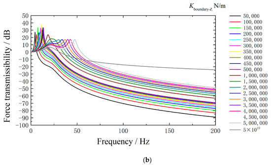 Effect of the horizontal boundary elasticity on force transmissibility of the 3-stage plate-isolator system: (a) in the X direction (Cboundary = 10 Ns/m, Kisolator-x = 56,321 N/m, Cisolator = 600 Ns/m); (b) in the Z direction (Cboundary = 10 Ns/m, Kisolator-z = 152,527 N/m, Cisolator = 600 Ns/m).