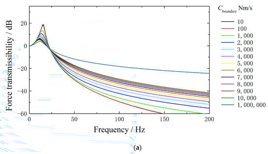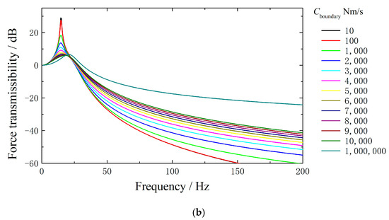 Figure 8b illustrates the influence of structural plate boundary damping Cboundary on the system response. When Cboundary = 105 Ns/m, the force transmissibility of the system is similar to the scenario when the boundary of the structural plate is rigidly constrained. When Cboundary = 100 Ns/m, the force transmissibility curve of the system exhibits two relatively high peaks. However, when Cboundary is increased to 1000 Ns/m–10,000 Ns/m, the force transmissibility of the system is improved compared to the 2-stage plate-isolator system.