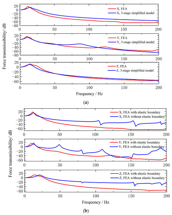 In the finite element model, each vertical boundary spring stiffness is set to , and each vertical damping coefficient is set to . In the transverse direction, the spring stiffness and the damping coefficient are and at each supporting point. Harmonic excitations are applied on the mass center of the flywheel. The predicted force transmissibility of the plate-isolator system with elastic boundaries is shown in Figure 12. In Figure 12a, FEA results of the plate-isolator system with elastic boundaries are compared with the 3-stage simplified model. The results of the lumped parameter theoretical model are qualitatively similar to the FEA results. In the vertical direction (y), the results of the multi-DOF finite element model and the lumped parameter theoretical model are a little different after 50 Hz; the main reason is that the lumped parameter theoretical model is not precise enough to illustrate the complicated mode shape of the structural plate. Nevertheless, in this study, the 3-stage simplified lumped parameter model is applied as a guide to choosing the appropriate stiffness and damping for the plate boundary. In Figure 12b, the force transmissibilities of the plate-isolator system with and without elastic boundary are compared. The predictions show that the vibration isolation effect of the plate-isolator system is obviously improved by the elastic plate boundary. In Figure 12b, it is demonstrated that the 3-stage simplified model is an effective tool to determine the boundary stiffness and damping for the plate-isolator system.