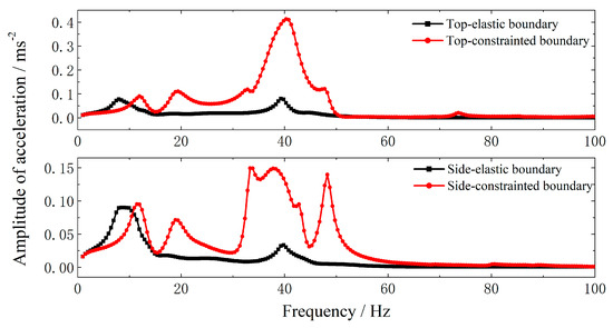 Based on the analysis results presented in Figure 8, the boundary stiffness of the structural plate is set to Kboundry = 0.1 Kplate = 337,800 N/m and the boundary damping coefficient is set to Cboundary = 2000 Ns/m. These settings enable the system to have a wider range of vibration isolation frequency and lower force transmissibility.