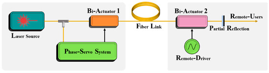Schematic of the basic principle of optical frequency transmission via fiber with the active phase-noise compensation system. Laser Source and Phase-Servo System represent continuous laser light and the active phase-noise compensation system, respectively. Bi-Actuator denotes bidirectional modulator.