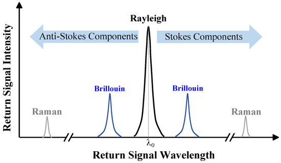 As shown in Figure 2, laser signals transmitted in optical fibers can result in nonlinear effects due to non-elastic collisions [24,29,30]. Depending on the optical intensity, two different nonlinear effects can occur: stimulated Raman scattering and stimulated Brillouin scattering. Both of these nonlinear effects are intensity dependent, but the optical intensity threshold for stimulated Brillouin scattering is significantly lower compared to Raman scattering. Even at lower power levels, Brillouin scattering can occur spontaneously, as it is driven by the scattering of phonons generated thermally. Higher input optical power leads to the generation of a large number of phonons, and when two counter-propagating optical waves in the fiber intersect, they create a moving refractive index grating. The greater the reflected optical power, the stronger the grating, resulting in higher effective reflectivity. When the incident optical power exceeds a certain threshold, stimulated Brillouin phonons can scatter a significant portion of the incident optical power back to the input end of the optical fiber. For silica optical fibers, the material itself exhibits relatively weak nonlinear effects, but the combination of a small effective mode area and long propagation length in the optical fiber greatly enhances these nonlinear effects.