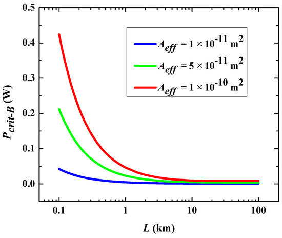 According to Equation (2), we assess the threshold power of generating the Brillouin scattering as a function of the optical fiber’s length with the various effective mode area , including 1 × 10−11 m2, 5 × 10−11 m2, and 1 × 10−10 m2. The corresponding results for the threshold power are presented in Figure 3.