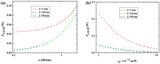 In Figure 4a, we present the threshold power for generating Brillouin scattering as a function of the attenuation coefficient of the optical fiber when the laser source linewidth , Brillouin scattering linewidth , and Brillouin scattering gain coefficient are set at 1 kHz, 10 MHz, and 5 × 10−11 m/W, respectively. Generally, when the fiber length is held constant, the threshold powers for Brillouin scattering increase with higher values of the attenuation coefficient of the optical fiber. For example, at = 50 km, the threshold powers for = 0.1 dB/km, = 1 dB/km, and = 2 dB/km are approximately 4 mW, 42 mW, and 84 mW, respectively. However, with = 1 km and = 0.5 dB/km, the threshold power for Brillouin scattering is approximately 53 mW, which is about 30 mW higher than that for = 10 km. Interestingly, when is varied between 0.1 dB/km and 2 dB/km, the threshold power for Brillouin scattering at = 50 km remains essentially unchanged compared to that at = 10 km.