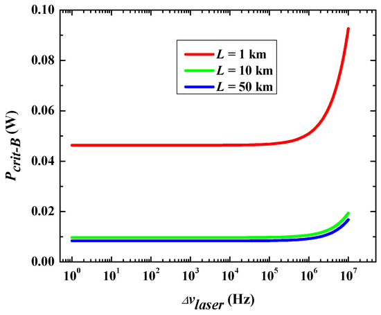 The threshold power for generating the Brillouin scattering as a function of the linewidth of the laser source. The attenuation coefficient of the optical fiber is 0.2 dB/km. The linewidth of the Brillouin scattering is 10 MHz. The gain coefficient of the Brillouin scattering is 5 × 10−11 m/W. The effective mode area of the fiber is 1 × 10−10 m2.
