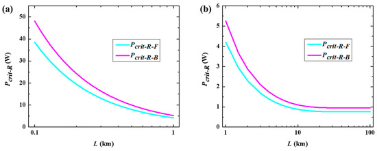 As shown in Figure 6, when the fiber length varies from 0.1 km to 1 km, the threshold powers, including for generating backward Raman scattering and for generating forward Raman scattering, are consistently in the vicinity of 10 W. This value is roughly two orders of magnitude greater than the threshold powers for Brillouin scattering at the same fiber length. This discrepancy can be attributed to the significantly higher gain coefficient of Brillouin scattering, which is approximately two orders of magnitude larger than the gain coefficient of Raman scattering. The threshold powers for generating Raman scattering are approximately 1 W for fiber lengths ranging from 1 km to 100 km. In cases where the fiber length is fixed, for backward Raman scattering is approximately 25% higher than that for forward Raman scattering. Generally, the threshold powers for Brillouin scattering exhibit a decreasing trend as the fiber length increases. For instance, for a 0.5 km fiber length, and are approximately 8 W and 10 W, respectively, and they decrease by approximately 3.8 W and 4.8 W, respectively, as the fiber length increases. However, for fiber lengths exceeding 10 km, the threshold powers for generating Raman scattering remain relatively constant, paralleling the behavior observed in Brillouin scattering.