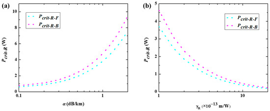 When the optical fiber’s length is 10 km, Figure 7a displays the calculated threshold powers for generating Raman scattering as a function of the attenuation coefficient of the optical fiber. It is observed that as the attenuation coefficient of the optical fiber increases, the threshold powers for generating Raman scattering also increase. For example, when the attenuation coefficients are 1 dB/km and 2 dB/km, the threshold powers for backward Raman scattering are approximately 4.8 W and 9.5 W, respectively, while the threshold powers for forward Raman scattering are approximately 3.8 W and 7.6 W, respectively. Furthermore, when the attenuation coefficient of the optical fiber remains constant at 0.5 dB/km, the threshold power for backward Raman scattering surpasses that of forward Raman scattering, with values of about 2.4 W and 1.9 W, respectively.