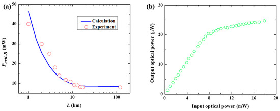 Comparison of calculated and experimental values of the threshold power for generating the Brillouin scattering. The attenuation coefficient and the effective mode area are 0.2 dB/km and 1.0 × 10−10 m2, respectively. The gain coefficient of the Brillouin scattering is 5.0 × 10−11 m/W. (a) Comparison of calculated and experimental values of the threshold power for generating the Brillouin scattering as a function of the optical fiber length L. (b) The experimental measurement results of the input optical power and the output optical power when the fiber length is 120 km.
