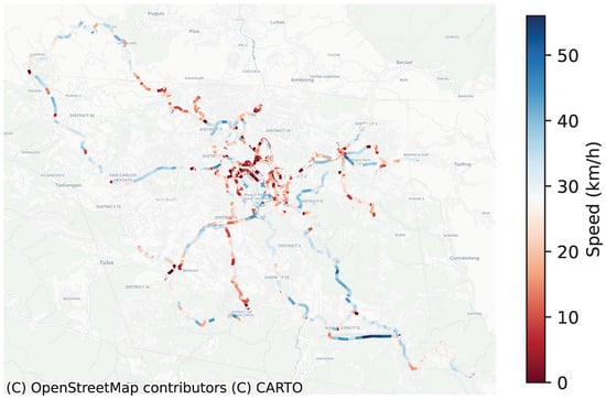 Figure 2 shows a sample GPS trace from a randomly chosen vehicle (GPS tracker id: 869731050330141) on 17 July 2023, from 8 a.m. to 8 p.m. Notice that the vehicle exhibited a mix of slow speeds (red) and fast speeds (blue).