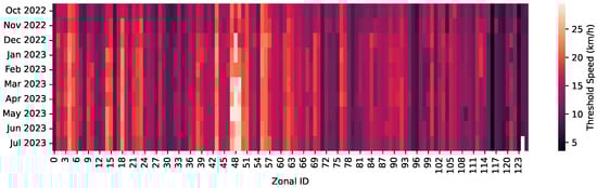 We obtained GPS data for 126 out of the 129 administrative subdivisions of Baguio city. This indicates that the probe vehicles have spent time in all but three subzones of the city, and thus, the index we calculated in this work is representative of the city. Figure 3 shows the monthly variation in the threshold for each zone with GPS information logged from probe vehicles. While there are significant variations in the value of the threshold across zones, for each zone, the monthly variation in the threshold is, in fact, minimal. This indicates that the ZSI values can be compared across time and is thus a valid dynamic index for mobility within the city.