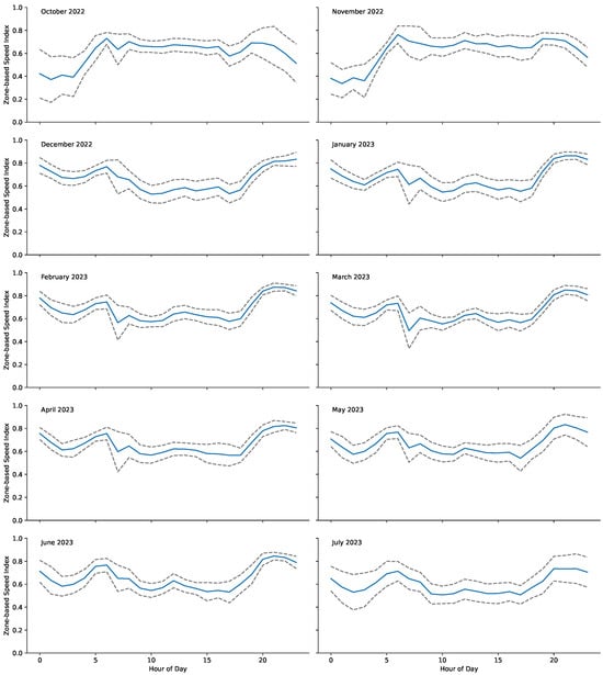 Intraday variation in the Zone-based Speed Index (ZSI) for ten months spanning October 2022 to July 2023. Higher values of the ZSI indicate better mobility. The solid blue line corresponds to the mean, while the top and bottom dashed lines are one standard deviation on either side of the mean. Both average and standard deviation are calculated across the days of the given month.