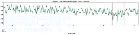 Hourly Zone-based Speed Index for the month of July 2023. The decrease in ZSI successfully captures the decrease in vehicle mobility when supertyphoon Doksuri passed through Baguio city on 26–28 July 2023 (red vertical lines).