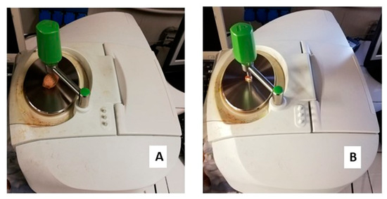 Acquisition of spectra: (A) on almond shell; (B) on the kernel.