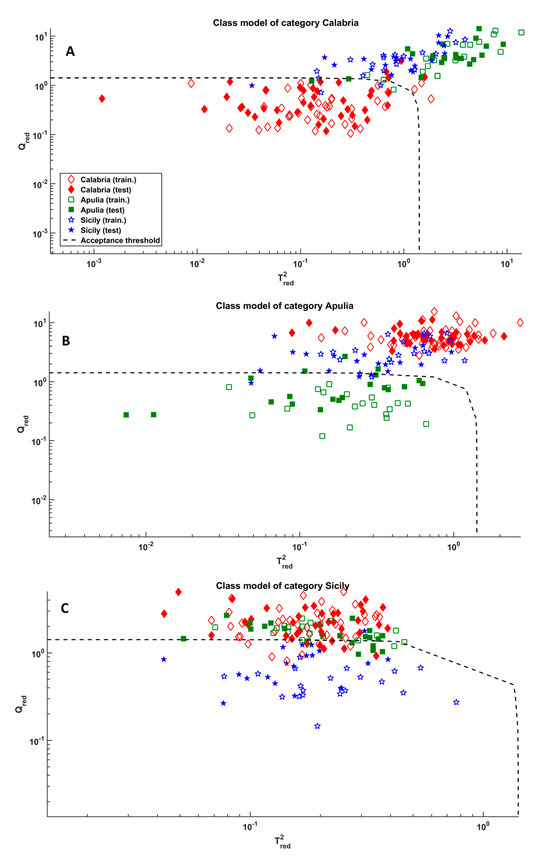 The outcome of the models can also be appreciated in Figure 2, where a representation of the SIMCA models’ prediction in the Tred2 and Qred spaces is given for classes Calabria (A), Apulia (B), and Sicily (C). From this figure, it is apparent that all models present a satisfying sensitivity in prediction (>85%) and high specificity (>92%), except for class Sicily, where a discreet number of objects from Apulia (~30%, six test samples) and Calabria (15%, six test samples) is erroneously accepted by the model.
