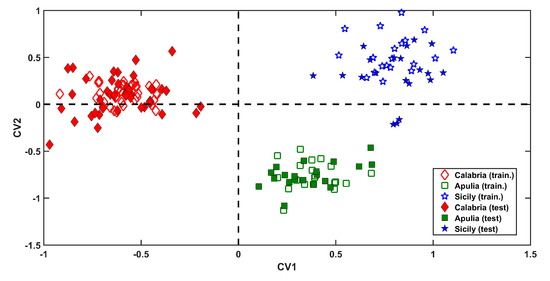 From Table 5, it is clear that the model allows for the correct classification of all test samples. Attaining a 100% accurate classification rate is noteworthy and indicates that the spectral data contain highly discriminating information about the geographical origin. This outcome can also be appreciated in Figure 3, where samples are projected onto the space spanned by the two canonical variates (CVs). From the plot, it is apparent that the three classes present three clear groups in the CV space. In fact, samples belonging to class Calabria (red diamonds) are the only ones presenting negative CV1 scores, whereas objects belonging to Sicily (blue stars) and Apulia (green squares) discriminate along CV2. Indeed, the greatest part of samples from Sicily fall at the positive CV2, whereas almonds from Apulia present negative CV2-scores.