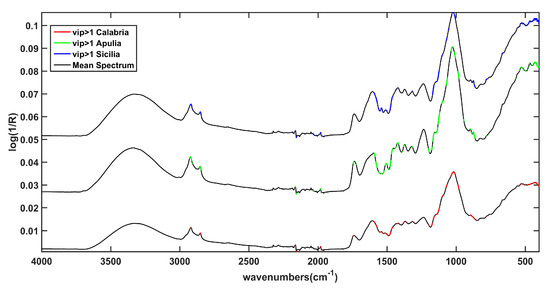 Briefly, the VIP analysis allows for the estimation of VIP indices, which represent the contribution of each variable to the solution of the classification problem. By construction, VIP indices higher than 1 are considered to be associated with significant variables. In Figure 4, a graphical representation of the spectral variables contributing the most to the model is shown. In particular, the black lines represent the mean spectrum (offset to make them visible), whereas red, green, and blue dots highlight significant variables for Class Calabria, Apulia, and Sicily, respectively.