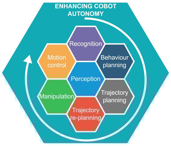 A system to increase the autonomous capabilities of robots must necessarily be modular, as it must handle heterogeneous systems. Modules can be associated with the single, basic tasks that the robot must perform in order to increase its autonomy. Complex tasks require a high degree of interdependence between these modules. Like most autonomous systems, the main tasks to be performed by a fixed-base cobot with increased autonomy are shown in Figure 2 and described below:
