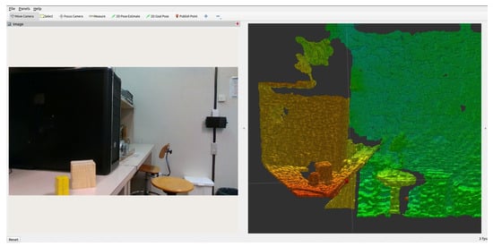 Regarding the perception entrusted to additional external sensors, the same concept applies, with ROS/ROS2 providing standard interfaces that must be implemented by the low-level modules handling real/simulated sensors. Again, sensors from different manufacturers, even more if of different types, require hardware-specific drivers that can be already available (sometimes provided by the same vendors) or to be developed. Despite the specific implementation, what should be standard in order to exploit existing ROS functionality are the topics where sensor data are published or rather their message types. In ROS2, this is ported from ROS1. sensor_msgs is a standard ROS package containing the definition of many messages relating to sensor devices such as cameras, inertial measurement units (IMUs), and laser range-finders [101]. For example, for an RGB camera, there is sensor_msgs/msg/Image, a message type intended to contain an uncompressed image with a header with fields such as timestamp, frame_id of the camera, image dimensions in pixels and encoding (e.g., rgb8), and a body that is the actual data matrix. Similarly, for a depth camera there is the message sensor_msgs/msg/PointCloud2 (previous PointCloud is deprecated since ROS2 Foxy) with information including timestamp, frame_id, dimensions in pixels (point-cloud data may be organized 2D, i.e., image-like, or 1D, i.e., unordered), number of fields with their dimensions (e.g., x, y, z coordinates and RGB value) and the actual point cloud. The implementation of these topics allows, for example, the immediate visualization of these RGB and depth data in RViz2 (i.e., the default 3D visualization tool for ROS2) as shown in Figure 4. Just selecting the desired standard topic enables RViz to subscribe to it and to display its data in real time.