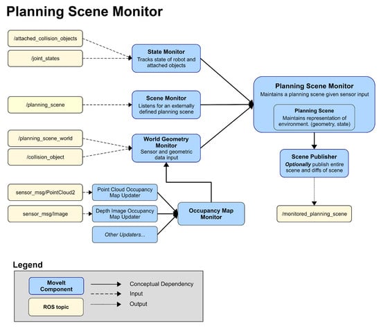 - Robotic, P. MoveIt 2 Documentation—Planning Scene Monitor. 2023. Available online: https://moveit.picknik.ai/humble/doc/concepts/planning_scene_monitor.html (accessed on 11 August 2023).