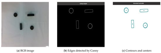 Finally, the problem of object detection must be addressed; it involves using the RGB image provided by the camera to classify and recognize specific objects in the scene with which the robot must interact (e.g., to grasp or avoid them), or of which it must be aware of the presence (e.g., markers or human workers). This problem, unlike the previous ones, does not have a standard solution even in ROS1. However, there are unofficial GitHub repositories that deal with it, such as darknet_ros, an ROS package (also tested for ROS2 Foxy) for using YOLOV3 (You Only Look Once Version 3 software library) within ROS [106]. YOLO currently represents a state-of-the-art library for object detection that is known for its speed and accuracy. This library applies a single fully convolutional neural network (CNN) to the entire RGB image to detect and classify objects on which its model has been pre-trained. In particular, the repository [106] makes it easy to configure the trained model as well as the topic from which images will be taken, and it publishes detection results on dedicated topics in both image and list form. Already standard, on the other hand, is the interfacing of ROS with OpenCV, an open-source software library for computer vision, machine learning, and image processing written in C/C++ also having interfaces in Python and Java [16,17]. In ROS1, there exists vision_opencv, composed of the packages cv_bridge (i.e., the bridge between ROS image messages and image representation used by OpenCV) and image_geometry (i.e., a collection of methods for dealing with image and pixel geometry), this is the standard that implements this interface, and it is currently reported that it is partially ported to ROS2, although the main features are already available. Figure 9 shows an example of image processing to compute the centers of contour/shape regions thanks to the functions provided by OpenCV, such as apply_canny, which implements the Canny algorithm for edge detection [107], and findContours, which finds curves on edge joining all the continuous points with the same color or intensity.