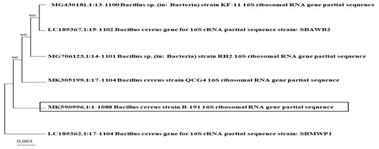 Figure 2. Phylogenic tree of Bacillus cereus strain B-191 (MK590996.1) isolated from yogurt and known bacterial relatives (using the neighbor-joining method) with MK305199.1, MG706123.1, MG430181.1, LC189367.1, and LC189362.1.
