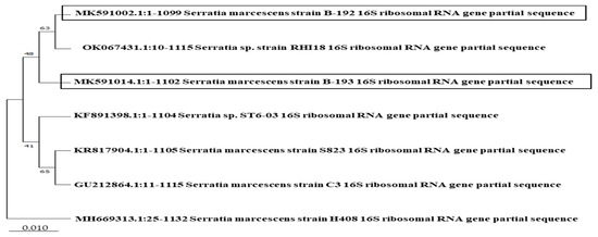 The isolation of genomic DNA was carried out to obtain pure DNA from the bacterial and fungal isolates. The extracted DNA molecules were used as templates for the PCR amplification of the 16S rRNA and ITS genes using the universal primers 27F, 1492R, ITS1F, and ITS4R, respectively, at an annealing temperature of 55 °C. The amplified products of the bacterial isolates were verified using 1.5% agarose gel stained with ethidium bromide, which revealed a fragment of 1088 bp for the B. cereus strain B-191, 1111 bp for B. subtilis, 1099 bp for the S. marcescens strain B-192, and 1106 bp for the S. marcescens strain B-193 when 16S rRNA was used. The M. circinelloides amplification was 600 bp when 18S rRNA was used as the ITS region. The sequence of isolates was submitted to the NCBI. The accession numbers for the bacterial sequence isolates were as follows: MK590996.1—B. cereus strain B-191, MK591144.1—B. subtilis strain B-195, MK591002.1—S. marcescens strain B-192, and MK591014.1—S. marcescens strain B-193 (Table 3). The accession numbers for fungal isolates were as follows: MK559692.1—M. circinelloides isolate (AUMC 10367), identified by internal transcribed spacer 1, partial sequence; the 5.8S ribosomal RNA gene and internal transcribed spacer 2, complete sequence; and the large subunit ribosomal RNA gene, partial sequence. Sequences from the GenBank nucleotide database were compared to the ones produced. A phylogenetic tree with a 98–100% similarity is used to identify the species. The MEGA 11 program was used to perform the phylogenetic analysis and sequence alignment.