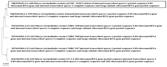 Figure 5. Phylogenic tree of Mucor circinelloides (AUMC 10367) (MK559692.1) isolated from yogurt and known fungal relatives (using the neighbor-joining method) with MK560184.1, MT603942.1, MT603901.1, MT603900.1, and KX349456.1.