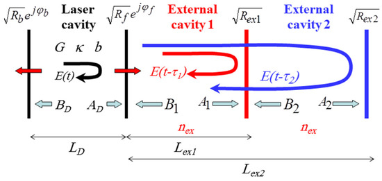 Figure 1 illustrates a model scheme of semiconductor lasers subjected to double OFB. The laser emitted from the front travels a round-trip in the cavity between the front and first reflector, Rex1. Then, a round-trip is made between the front facet and double reflector Rex2, which then re-enters the laser cavity. That is, there are time delays τ1 and τ2 between the laser reflected by the front of the laser facet into the cavity of the laser and the laser entered back from single and double reflectors, respectively [12]. By supposing Lex1 and Lex2 to be the lengths of the single and double external cavities, respectively, and the external cavity refractive index nex, the feedback laser has time delays of
