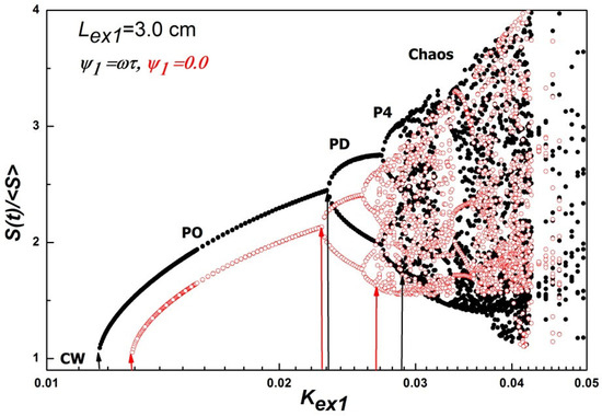 LD dynamic states induced via the single external cavity at two values of optical phase ψ1 = 0.0 (red color) and ωτ1 (black color) are shown in Figure 2. The dynamic states are calculated with BD of the photon number S(t), peak value, with the OFB strength Kex1. Abdulrhmann et al. investigated the influence of including the noise sources in the rate equations on the amplitude of pulsation and found that it is larger when counting the noise sources in the rate equations [6]. Since including the noise sources in the rate equations has a very little variation on the dynamic states induced via OFB, especially in the transition border to another state [6]. Langevin noise sources are omitted from the rate Equations (1)–(3) in the calculations of the BDs to get a clear vision of the dynamic states of the laser. The LD continues oscillating with the CW state for sufficiently small values of OFB strength Kex1, which is represented by no points in the figure. When Kex1 goes beyond the HB point (pointed by the first arrow) of Kex1 = 0.0129 and 0.0117 in the case of optical phase ψ1 = 0.0 and ωτ1, respectively, the LD dynamic state is identified with PO output for relaxation oscillations undamped. This PO is of the one-period kind with frequency increases with an increase in Kex1. The POs continue up to Kex1 = 0.0227 and 0.0231, with optical phases ψ1 = 0.0 and ωτ1, respectively. Beyond the PO regime, the bifurcation diagram shows two branches indicating the appearance of oscillations with period doubling (PD) (pointed by the second arrow). When Kex1 > 0.027 and 0.029 and optical phase ψ1 = 0.0 and ωτ1, respectively, the PD oscillation bifurcates more and shows many random points and tours, which represents a chaotic dynamic state (pointed by the third arrow). The shown PD route-to-chaos recognizes the LD with a short external cavity of fex/fr > 1.0, as shown in Ref. [30]. By reducing the optical phase ψ1 to zero the strength of the LD is decreased, and the dynamic states are shifted toward increasing the OFB intensity Kex1 up to the PO region, which leads to more stability, as shown in Ref. [10]. However, after the PO region, the dynamical regimes such as PD and chaos start to appear at lower values of Kex1. As shown in the figure, reducing the optical phase ψ1 from ωτ1 to 0.0 has no effect on the route-to-chaos, which keeps the PD route-to-chaos.