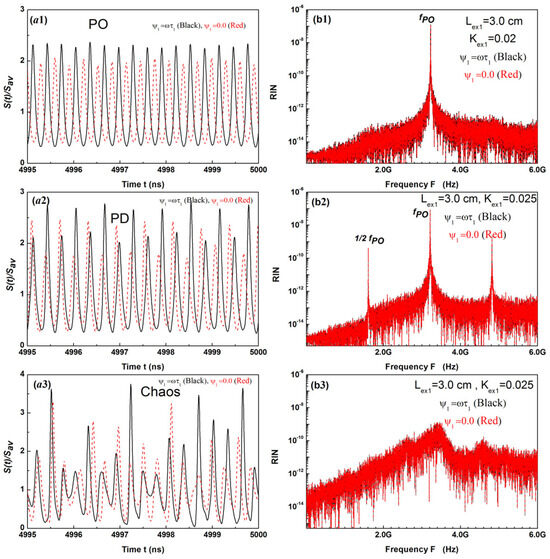Examples of the different dynamic states of the single external cavity laser shown in Figure 2 are characterized in Figure 3, when optical phase ψ1 = 0.0 and ψ1 = ωτ1; namely, the PO, PD, and chaos at OFB strength Kex1 = 0.02, 0.025, and 0.04, respectively. Figure 3 plots the photon numbers S(t)/SAV time variations and the corresponding RIN power spectrum, which is calculated using the fast Fourier transform of S(t) using Equation (14). The intensity of S(t)/Sav is decreased, and the phase is shifted by decreasing the optical phase ψ1 from ωτ1 to zero in all laser states, as shown in Figure 3(a1–a3). The effect of varying optical phase ψ1 due to OFB on the laser fluctuations has been noticed in Refs. [9,11,31] and confirmed experimentally in Ref [11,31]. The reduction in the intensity of S(t)/Sav is shown in Figure 3b as a little reduction of RIN. As found in Figure 3(b1), RIN shows a sharp peak at PO frequency fPO = 3.221 GHz and its higher harmonic peaks, which represent uniform periodic oscillations with the relaxation frequency ~ fr = 3.22 GHz. The RIN power spectrum in the PD dynamic state is distinguished by two sharp peaks at PD frequency fPD = 3.2 GHz and its half harmonic, as shown in Figure 3(b2). An unequal time type of S(t) variations represents the chaotic operation as displayed in Figure 3(b3). These inequalities in the output of the LD are created due to operating the LD unstably with two conditions: one of them identifies the LD with a frequency of fLaser = 3.4 GHz and the other to the compound cavity with a frequency of fComb = 4.6 GHz [9].
