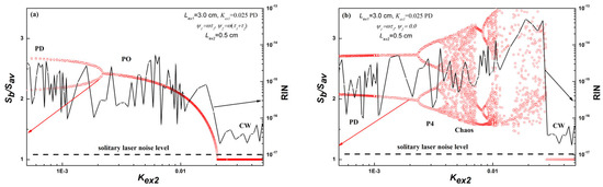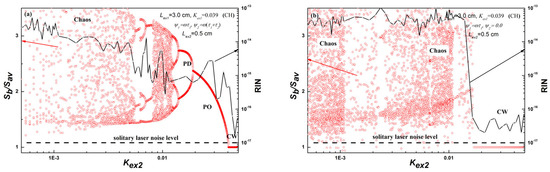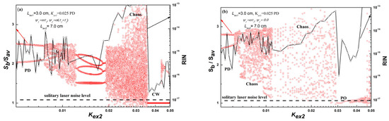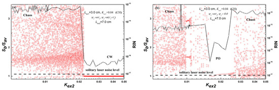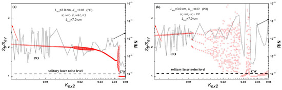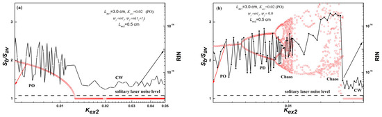 In the same Figure 4, Figure 5 and Figure 6 and on the right Y-axis, the average RIN at Low-frequency (f < 10 MHz) versus the double cavity OFB intensity Kex2 corresponds to the BDs shown. Figure 4a shows the Low-frequency RIN in the PO regime; as shown in the figure, it is almost in the range of 10−15 to 10−14 and decreases to approach a solitary laser noise level (dashed line) with increasing the double OFB strength Kex2. As ψ2 = 0.0, Figure 4b displays RIN enhancement when dynamic states transfer from PO, PD, and chaos regimes till reaching the CW state. The level of the RIN is reduced near the level of solitary laser noise. Figure 5b and Figure 6a,b show the highest level of the RIN, which occurs almost in the chaos regime. We notice that by reducing the optical phase ψ2 to 0.0, the RIN displays a lower level than that as of ψ2 = ω(τ1 + τ2) in the CW, PO, and PD regimes.