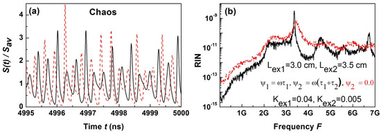 RIN of chaotic state with Kex1 = 4 × 10−2 and ψ1 = ωτ1, at Kex2 = 5 × 10−3 (Lex1 = 3 × 10−2 m, Lex2 = 3.5 × 10−2 m), ψ1 = ωτ1, ψ2 = 0.0 (red color), and ψ2 = ω(τ1 + τ2) (black color): (a) time variation and (b) RIN.