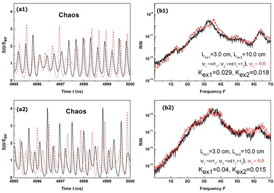 RIN of chaotic state with Lex1 = 3 × 10−2 m and Lex2 = 10 × 10−2 m, ψ1 = ωτ1, ψ2 = 0.0 (red color), and ψ2 = ω(τ1+ τ2) (black color): (a1,b1) time variations and RIN at Kex1 = 0.029 and Kex2 = 0.018; (a2,b2) time variations and RIN at Kex1 = 0.04 and Kex2 = 0.015.