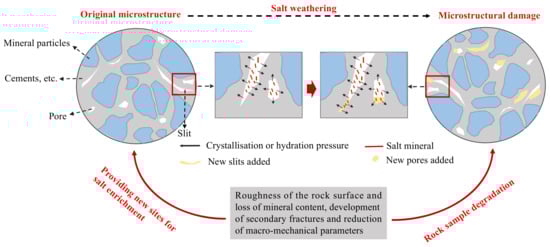 - In the initial stage of the experiment, the mass of sandstone increased due to two main factors. Firstly, the fresh sandstone had a relatively large initial porosity, allowing the crystallites formed by salt weathering to accumulate in the surface pores and fractures of the rock. This resulted in only minor damage within five cycles. Secondly, the crystallites generated during the cycling process block the throats of the pores and fractures, creating liquid-filled voids. This led to an increase in the water content inside the rock sample [25,26].