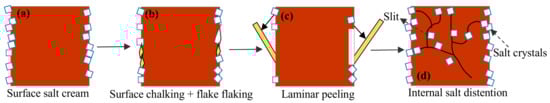 - Sun, M.L.; Liang, C.X.; Shen, Y.X.; Shang, X.J.; Cao, Z.J. Characteristics of salt damage to sandstone grottoes in Northwest China and contributing factors. J. Earth Environ. 2022, 13, 543–556. [Google Scholar]